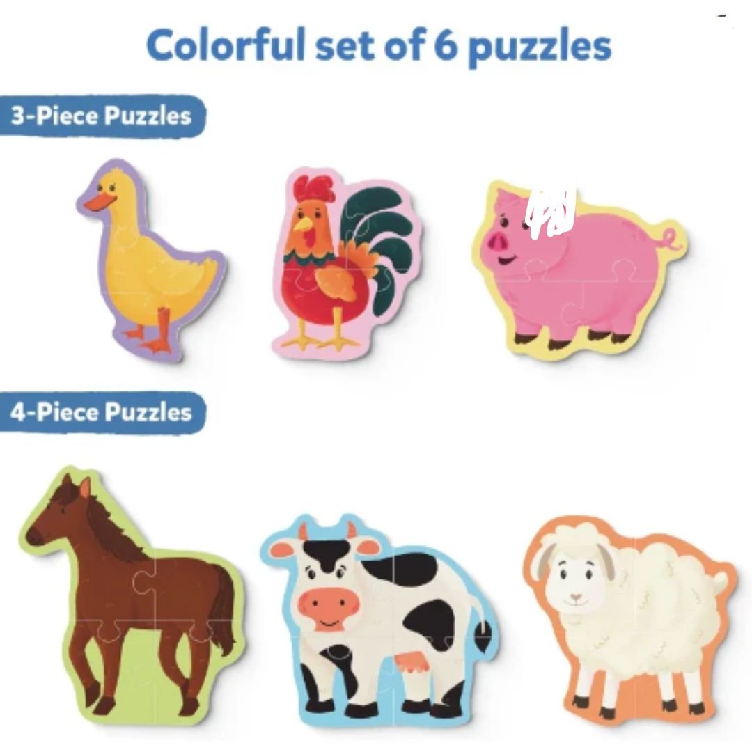 The set features large, easy-to-handle puzzle pieces, perfect for little hands. With charming illustrations of farm animals, tractors, barns, and fields, kids can build fun farm scenes by connecting the pieces together. Each puzzle is designed with simplicity in mind, so children can experience the joy of completing the puzzle on their own while learning about farm life.