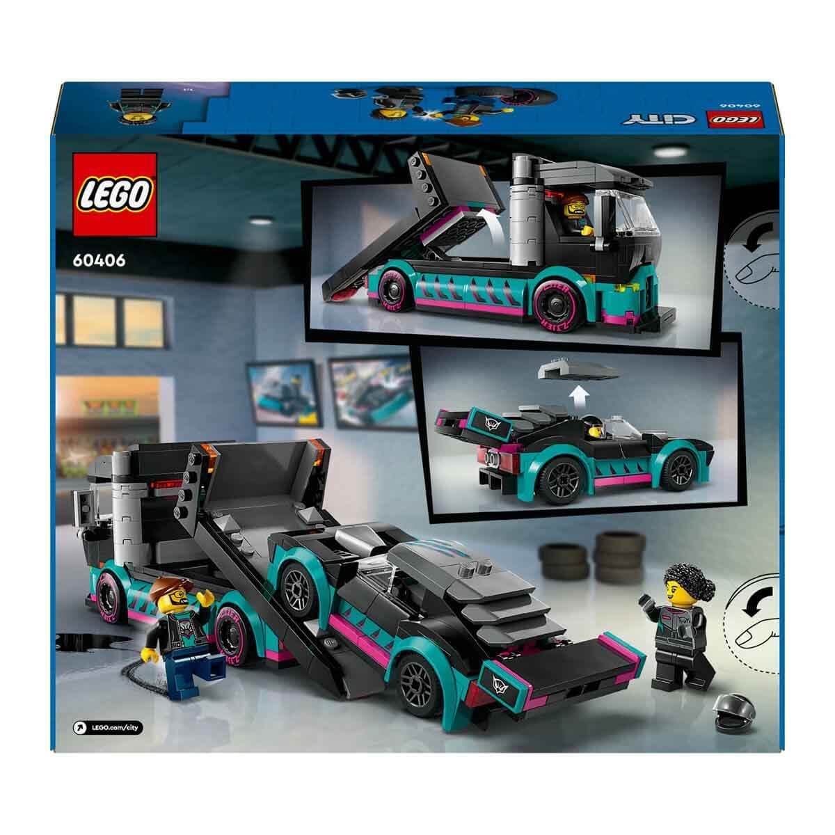 Includes: Race car, car carrier truck with detachable trailer, 2 minifigures, and fun accessories
