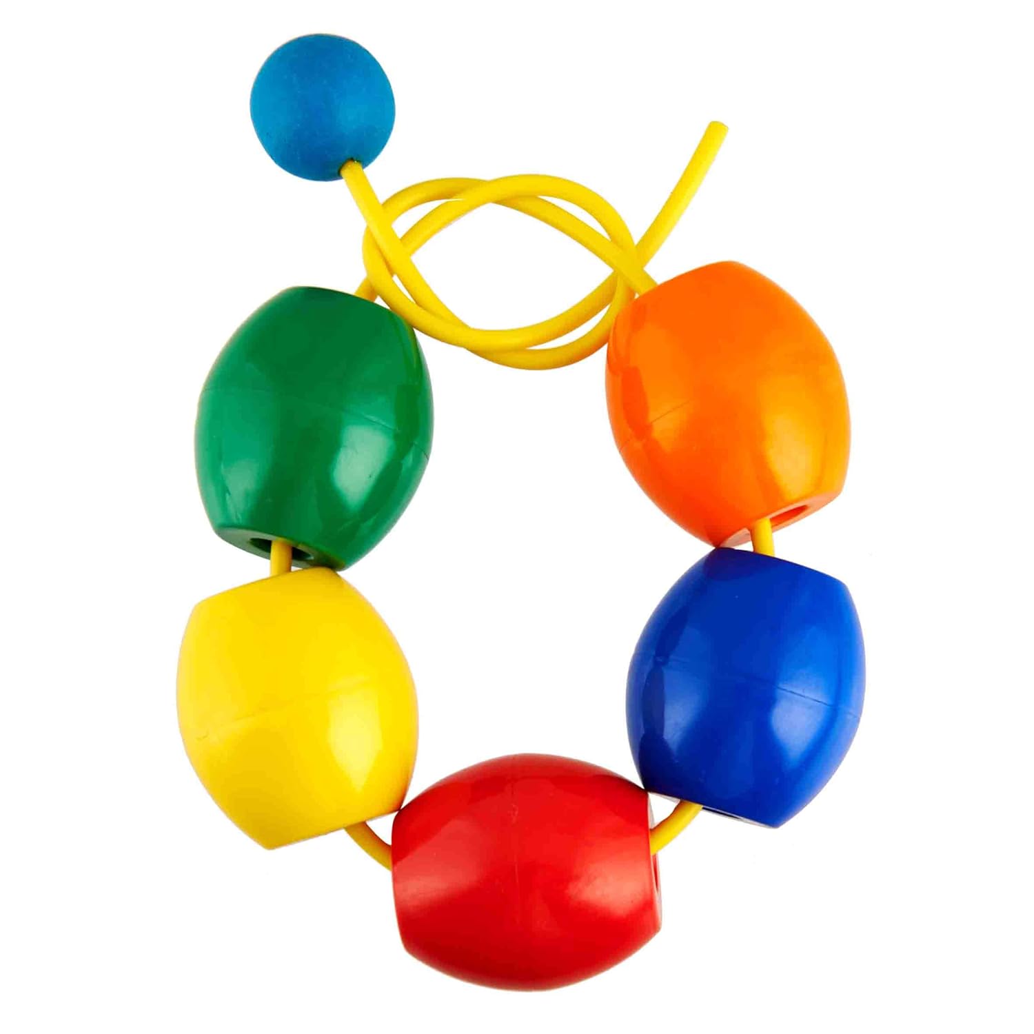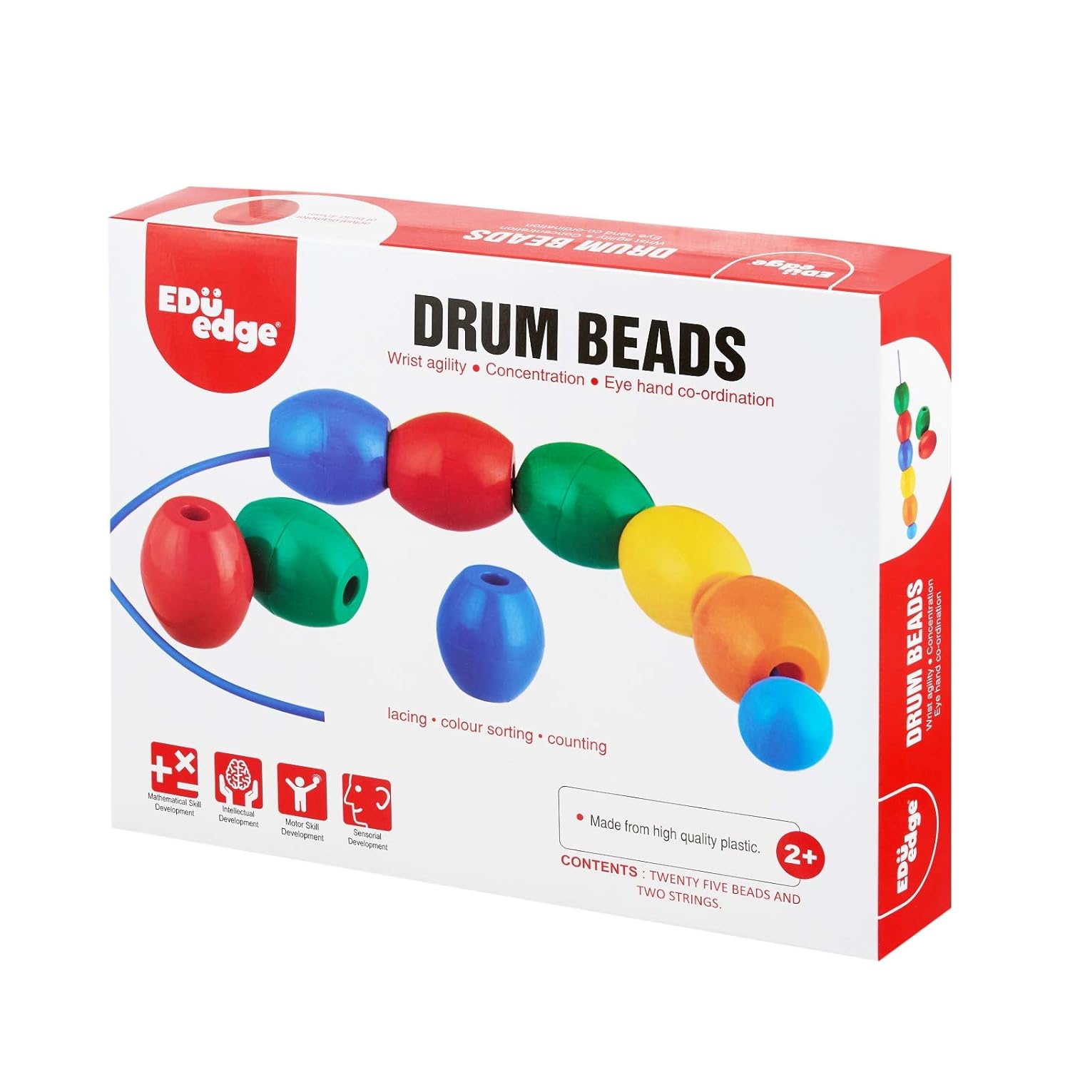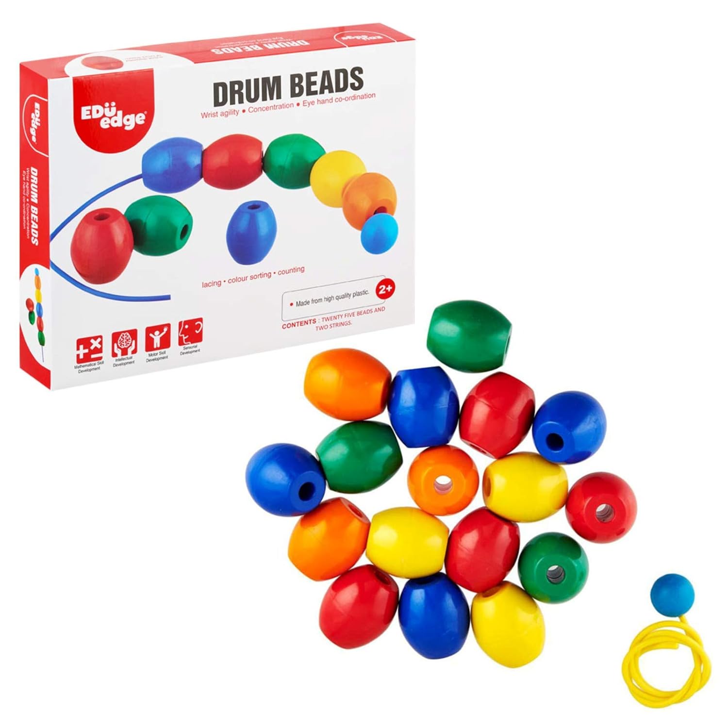 Educational lacing, counting and colour sorting toy: Each box contains 25 colourful drum beads and 2 strings with a stopper.